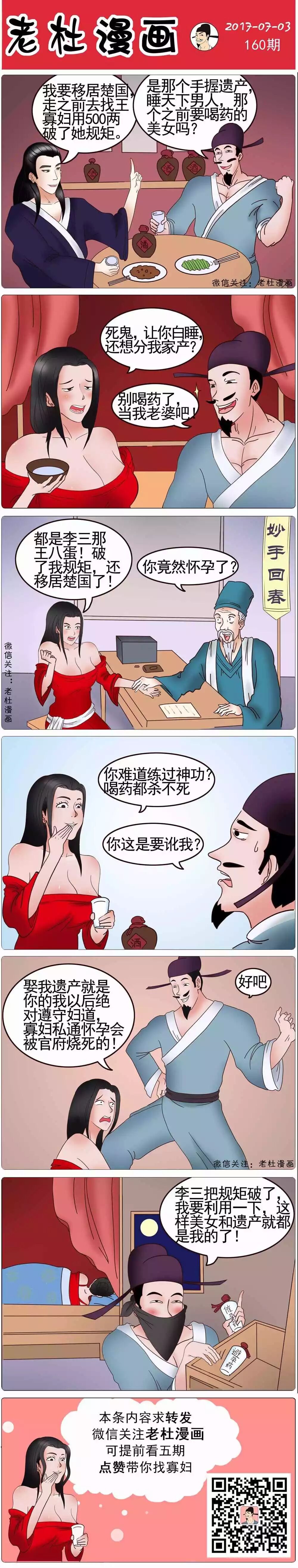 村里有个寡妇很有钱还和好多男人有染,寡妇有个规矩就是每次之前就会喝药避免怀孕,有一天李三和老杜喝酒,李三要移居楚国,想走之前用500两银子引诱寡妇,不让他喝药,破了她的规矩,老杜深深记在心里。过了几天,老杜找到寡妇,开玩笑说不让寡妇喝药,寡妇哪里会同意老杜的要求?也怕老杜分自己的家产...又过了几天,寡妇怀孕了,以为是李三破了自己的规矩导致的,很是生气,自己害怕于是想嫁祸于老杜,老杜心知肚明,故意说寡妇要讹人,寡妇一看计谋被识破,跪地求饶,害怕自己因私通而被烧死,所以拿自己和财产财产想要说服老杜,老杜爽快答应。其实孩子是老杜的,在老杜找寡妇之前(最后一格漫画应该在第二格漫画之前),老杜把寡妇的药调包了,寡妇以为孩子是李三的,其实孩子是老杜的,老杜将计就计,既得到了寡妇,又得到了财产!