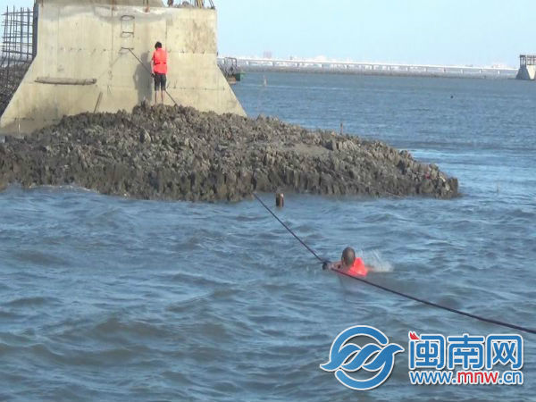 接警后,晋江消防大队陈埭中队消防官兵立即赶到现场,此时正涨潮,风浪较大,无法下水过岸营救。后来,消防官兵利用抛投器,将绳索抛射到对岸,用抛投器的绳索先给被困人员传送救生衣、腰带及50米长绳。