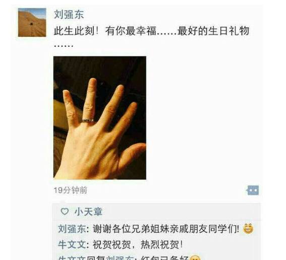 2月,疑似刘强东晒婚戒的朋友圈截图曝光,甚至照片底下还有奶茶妹妹的账号也点了赞,二人似乎是好事将近。随后春节时,刘强东更带着奶茶妹妹回乡给父老乡亲发红包,更向众人介绍奶茶妹妹就是自己的“媳妇儿”。