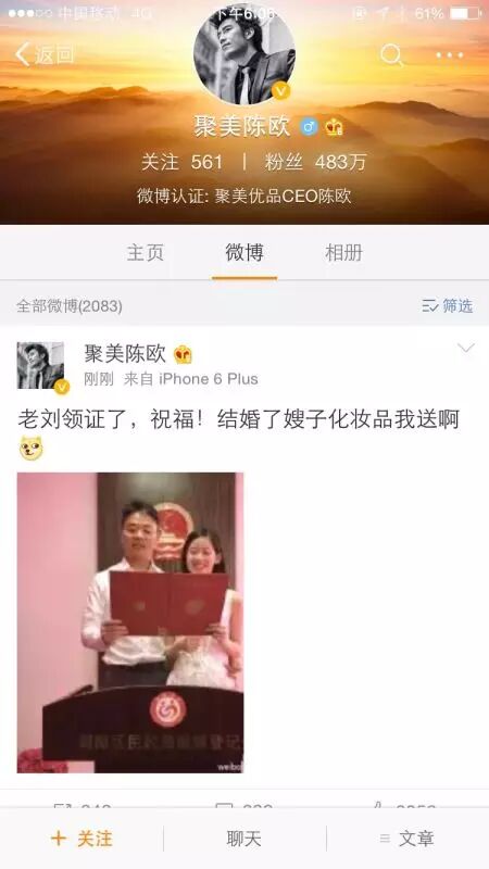 聚美优品的CEO陈欧在自己微博送上了祝福。不过话里带着各种酸味也是醉了。80后的陈欧管90后的章泽天叫嫂子,你这是几个意思?