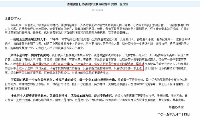 而据O姐查证,早在9月24日,某论坛内就已爆出苏宁这封内部信。时隔两个多月,就在昨日京东老板娘爆出怀孕,今天这封信又卷土重来,不得不让人怀疑,苏宁这裁员真是选对了时机。