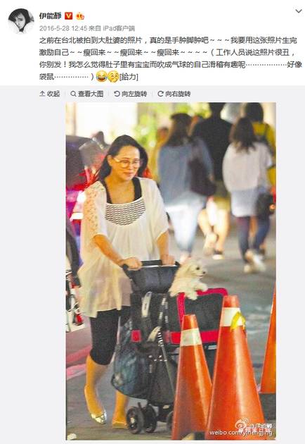 伊能静还曾把这张照片发到微博上,工作人员劝她不要发自己的“丑照”,然而伊能静却以乐观的心态来面对这一切,并且用以激励自己“瘦回来!”