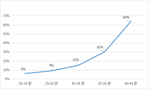 我们先来看一组大数据:在已婚妇女中,不孕症的发生率20-24岁为6%,25-29岁为%,30-34岁为15%。而到了35-39岁为30%,比上一个年龄段足足翻了一倍!到了40-44岁,不孕症发生率更高达64%!