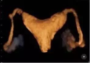 三维超声下输卵管造影术:子宫形态规则饱满,输卵管圆润通畅,似乎还可以看到造影剂正从伞端汩汩地流出来——输卵管通畅!