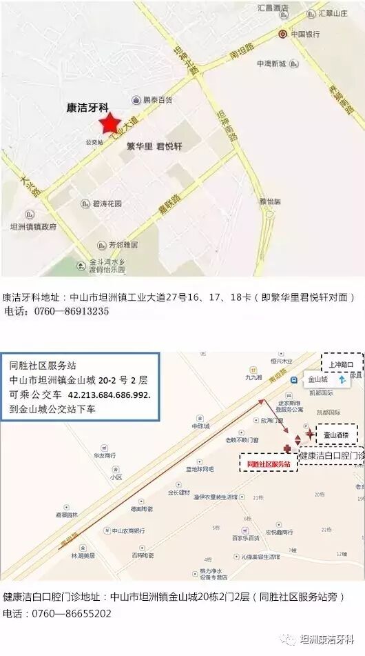 健康洁白口腔门诊部位于坦洲镇金山城小区内,同胜社区卫生服务站旁。