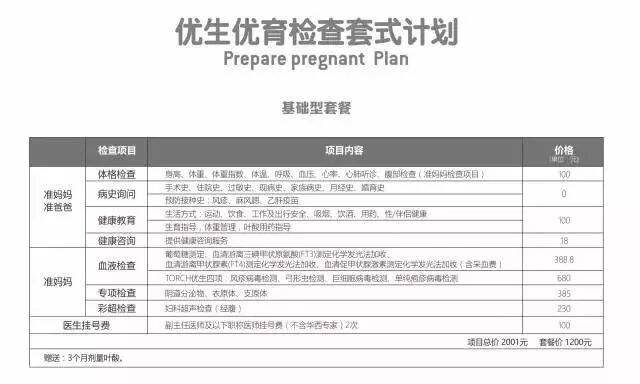 ❶购基础型套餐,899元发售(原价1200元),并免费赠送3个月剂量叶酸,套餐含准爸妈两人体格检查和医生问询。