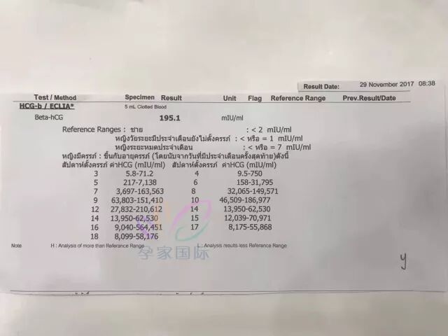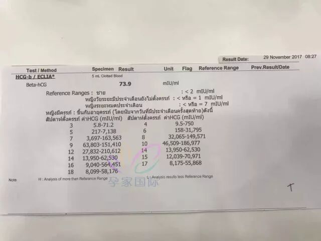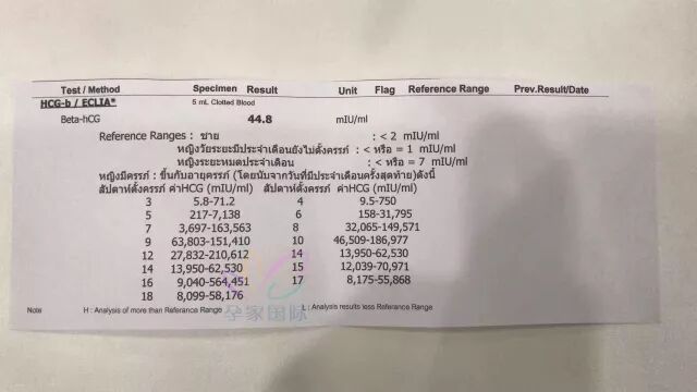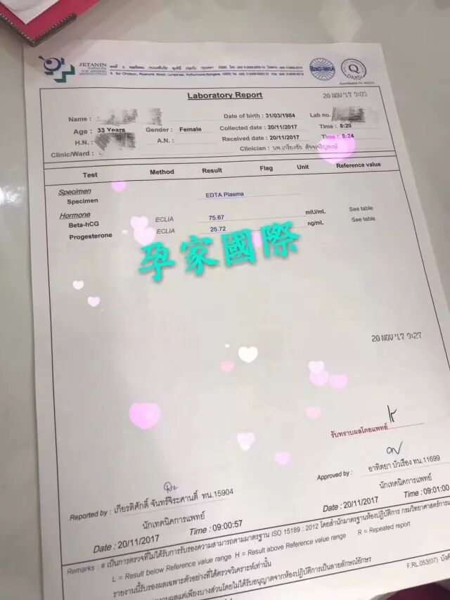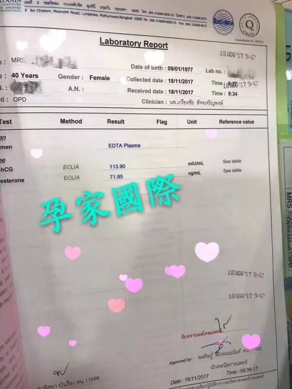 跟杰特宁医院的chai医生交流后,了解到泰国第三代试管技术非常成熟,医生给了她极大的信心,立即签约,8月份赴泰促排取卵,11月初去移植,前天发了移植后第七天验孕报告,血值相当漂亮,很大可能是龙凤胎哦继续加油