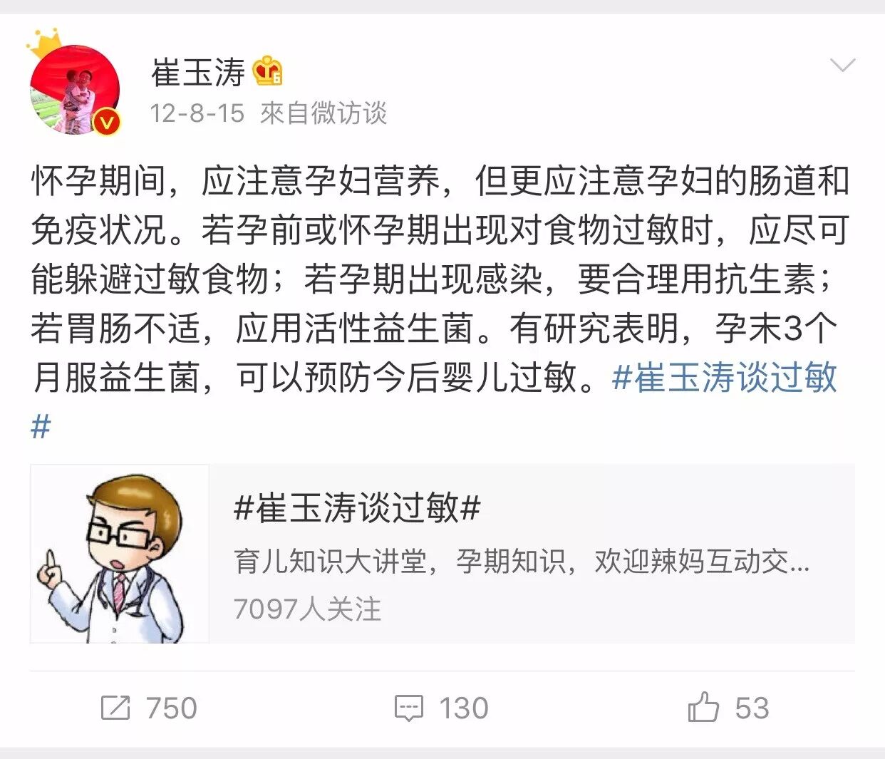 另外儿科医生崔玉涛建议孕末3个月服用益生菌,可以预防今后婴儿过敏。