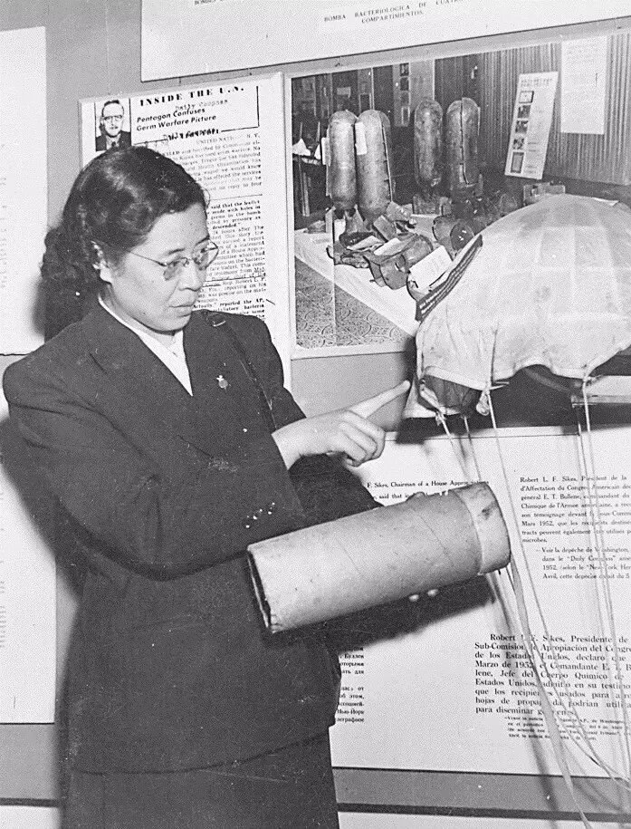 严仁英在细菌战罪行展上向国外观众讲解美国用小降落伞投放有害细菌的情况