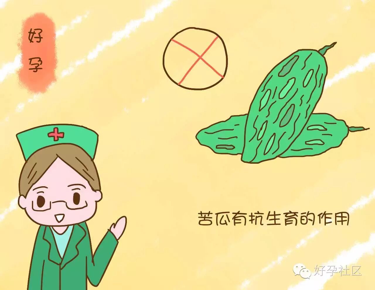 苦瓜:据研究发现,苦瓜确实有抗生育的作用,苦瓜蛋白在孕早期和孕中期抑制子宫内膜分化、干扰胚胎着床,而且孕早期食用苦瓜可能会有流产的风险。