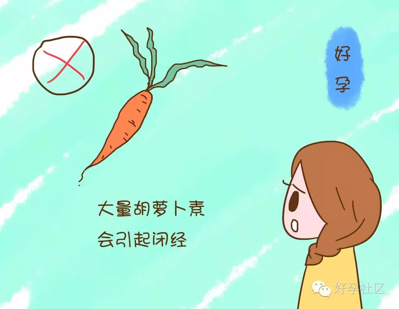 胡萝卜:据研究发现摄入的大量胡萝卜素会引起闭经和抑制卵巢的正常排卵功能。因此建议备孕期的女性要少吃胡萝卜。