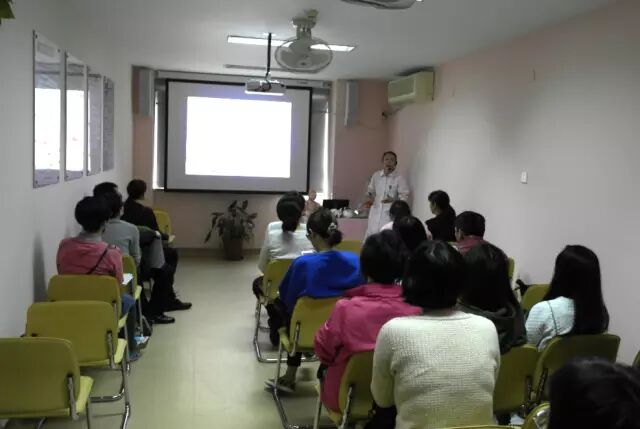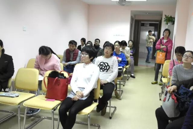 看看孕妇讲堂的环境: 粉红的墙、奶黄的座椅,很温馨的有没有?大大的屏幕,最后一排也看得见。