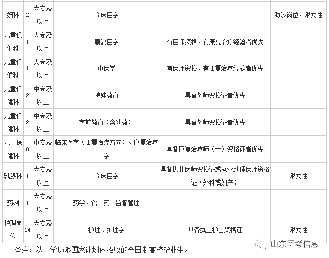 4、报考产科、儿科岗位的人员,年龄限40周岁(1977年11月30日之后出生)以下;报考护理岗位的人员,需2014年及以后毕业,全日制大专及以上学历,护理专业,未婚;妇科助诊岗位,限大专及以上临床医学专业的,2017年毕业生。其余专业技术岗位人员需取得中专及以上学历,年龄限35周岁(1982年11月30日以后出生)以下。