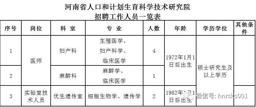招聘专业技术岗位人员7人。详见附件1:《河南省人口和计划生育科学技术研究院招聘工作人员一览表》。
