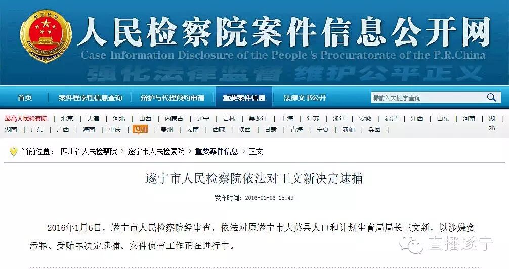 记者今日从人民检察院案件信息公开网获悉,2016年1月6日,遂宁市人民检察院经审查,依法对原遂宁市大英县人口和计划生育局局长王文新,以涉嫌贪污罪、受贿罪决定逮捕。案件侦查工作正在进行中。