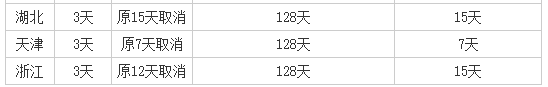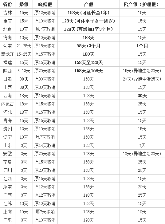 这29个地方在新规定中均取消了晚婚假,同时对产假和男性陪产、护理假做出一定调整。调整后,山西、甘肃婚假达30天,黑龙江、河南、陕西的夫妻参加婚检可增加婚假天数,重庆女性产假在128天基础上可延长休至子女一周岁,云南的男方护理假有30天。