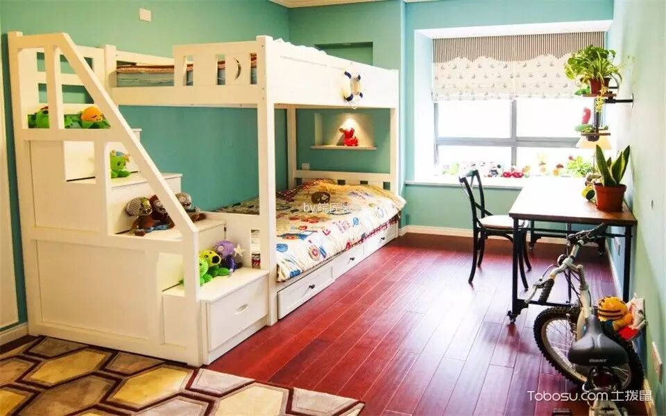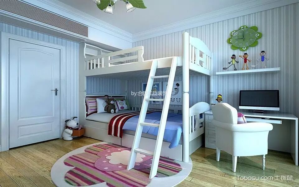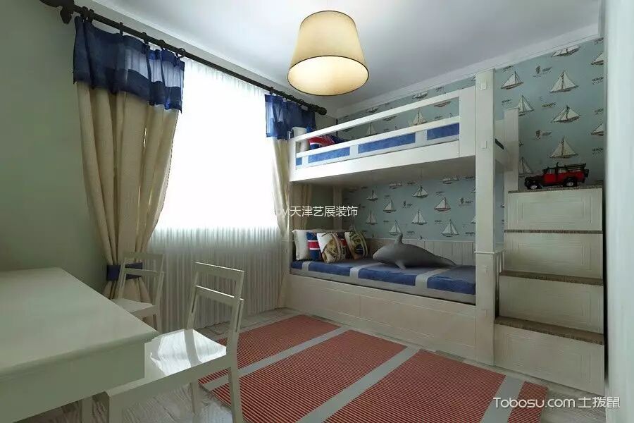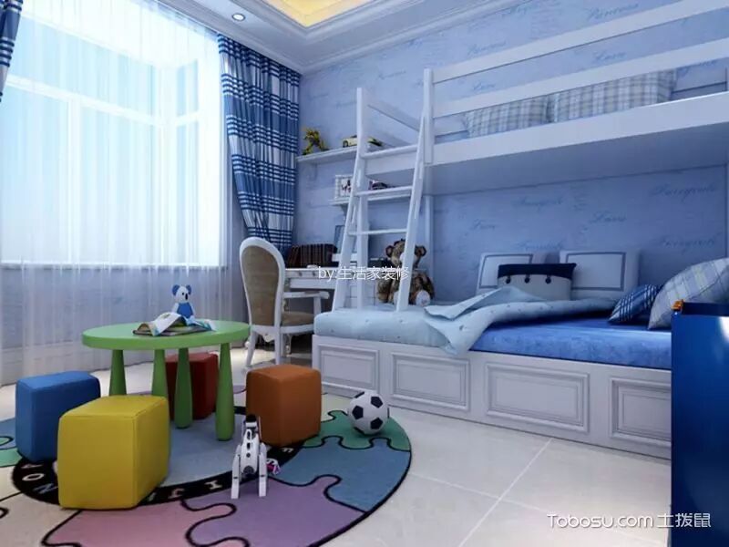 第一张儿童房双层床效果图里的床是具有普遍性的,传统的上下结构、爬梯,然后在下铺增加了小柜子,更加具有实用性。墙壁壁纸与窗帘都以蓝色为主,因此选择白色十分合适,与五彩的小桌椅也很搭。