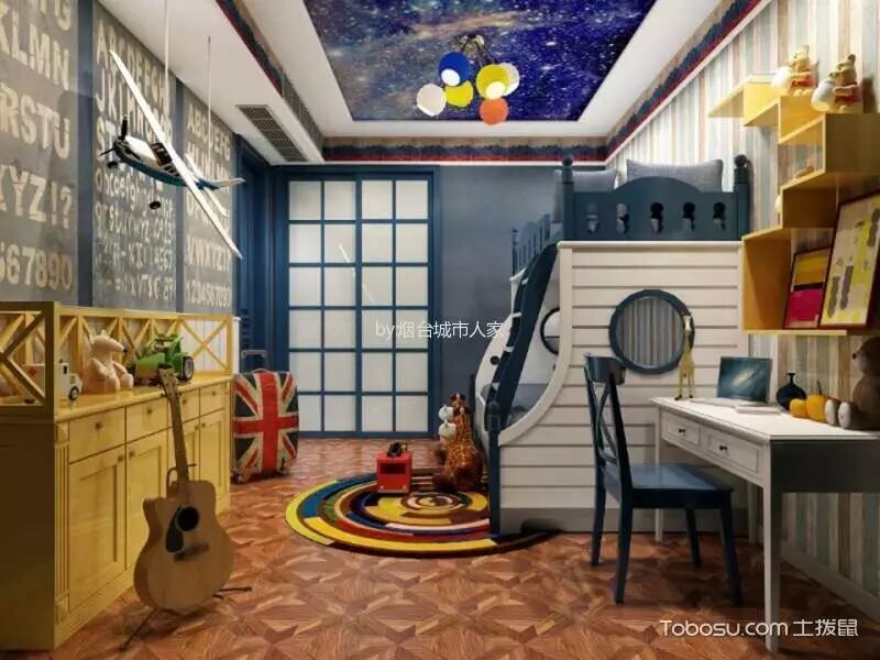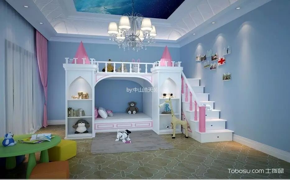 对于女孩子来说,公主城堡自是最渴望的,因此这张儿童房双层床效果图便将床设计成小城堡,楼梯还设计成小柜子,满足日常放置小物品如鞋子、玩具等的需要。为了更加逼真,还把天花也装饰成美丽的天空。