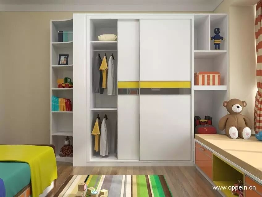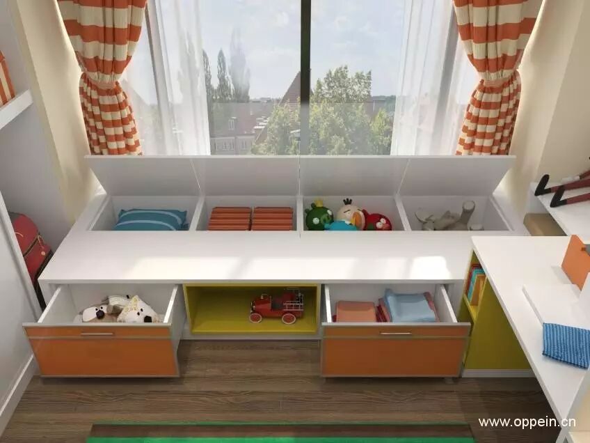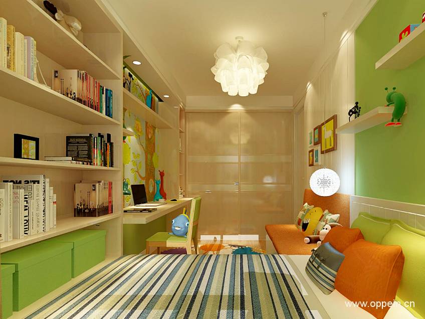 灵活运用墙面的空间,设计出强大的收纳天地。“一”字型书柜书桌设计,节省了卧室的空间,也增添了收纳容量。衣柜内嵌到墙内,为孩子腾出更多的活动空间。