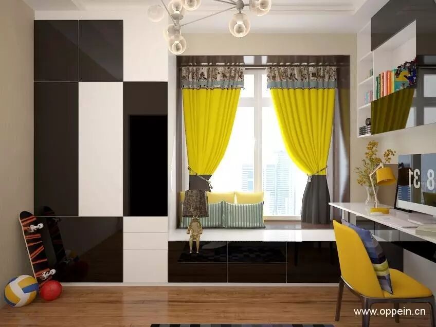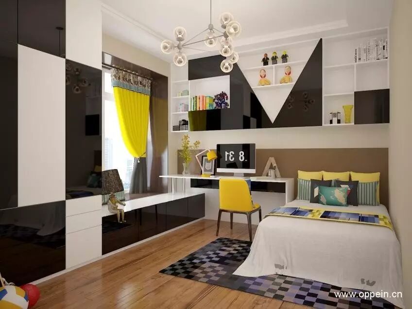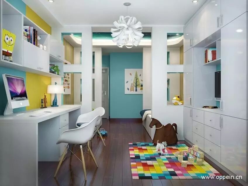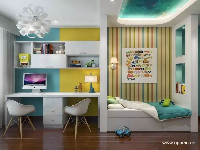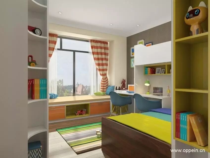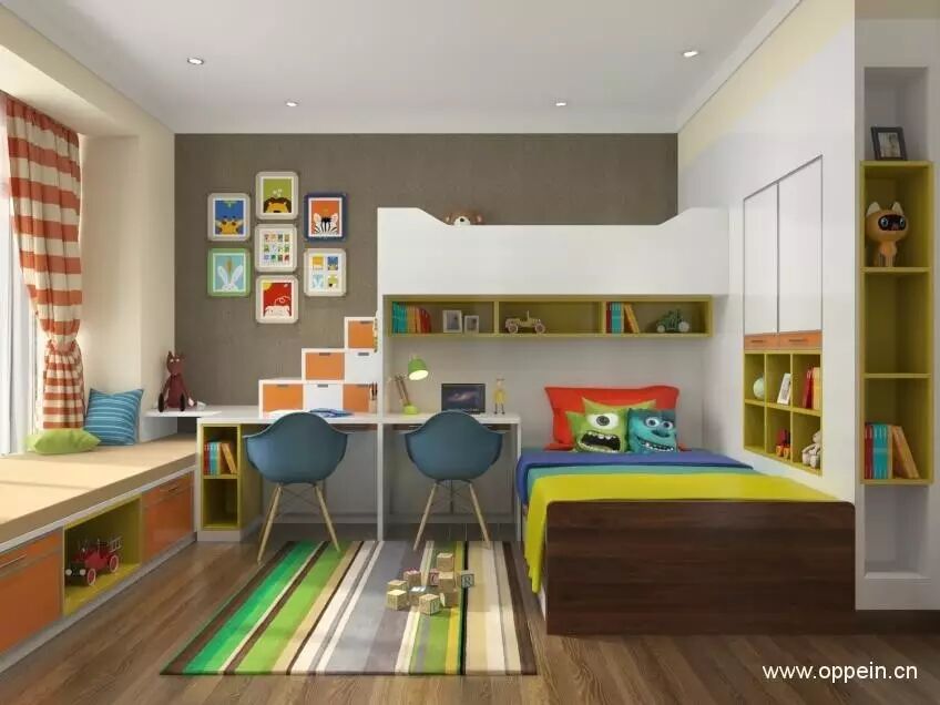 新颖独特的双人儿童房,活泼靓丽的色彩发掘出孩子们创造力。灵活多变的储物空间,让房间充满童趣,激发孩子们更多的探索精神与与学习乐趣。