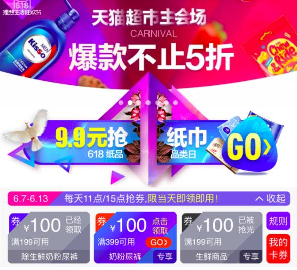 从7日起至13日天猫超市每天上午11点和下午15点均可领取超市满199-100、生鲜满199-100奶粉尿裤满399-100超级现金券各!一!张!