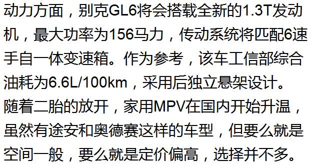 根据之前的信息,别克GL6的长宽高分别为4692/1794/1626mm,轴距为2796mm,并提供5座以及6座车型供消费者选择。