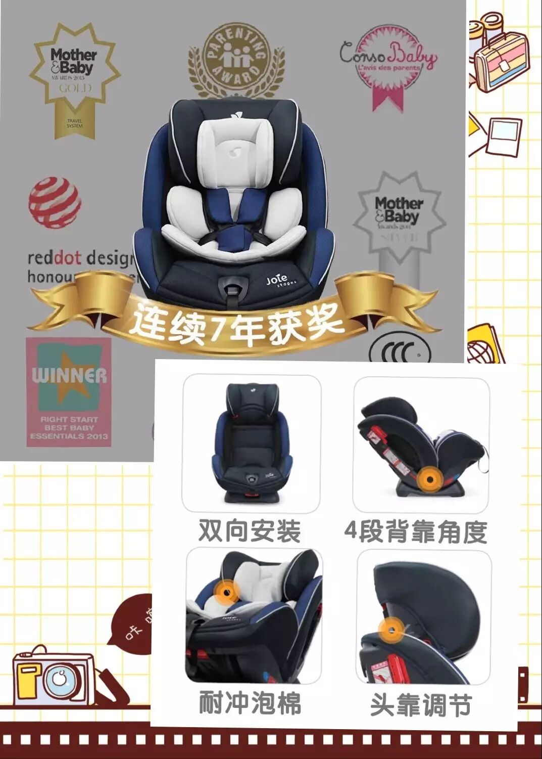 出院就要用到的安全提篮或者新生儿可用的安全座椅,做节目已经说过很多回安全座椅、安全提篮的重要性。不细说了,朋友赠送巧儿宜的安全座椅,目前使用起来不错,好安装,可以倒着放,一岁以前必须倒着坐,颜色耐脏。据说在英国多次获奖的品牌。