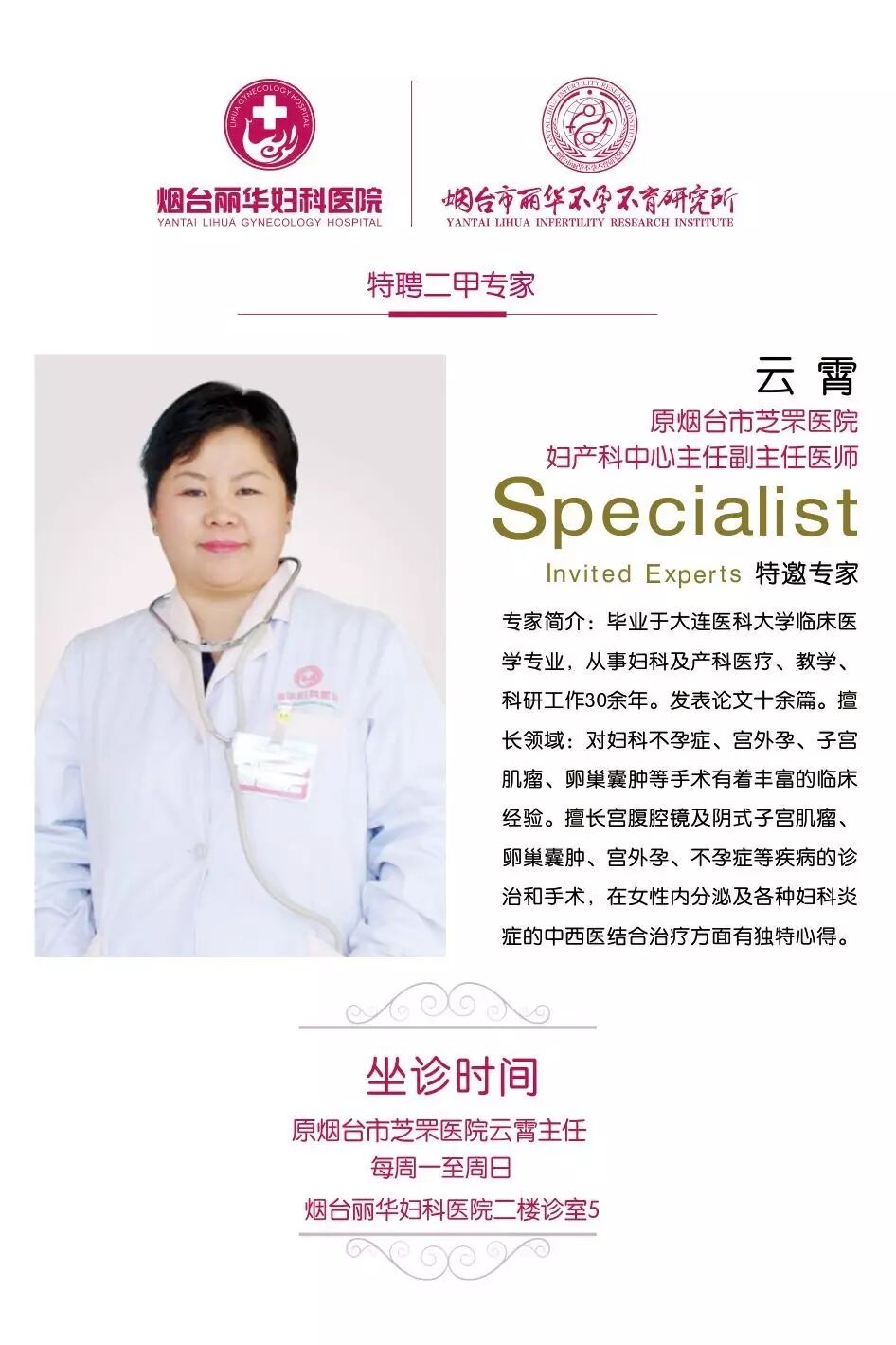 云霄,烟台丽华妇科医院妇科主任,副主任医师,原芝罘医院妇产科主任,烟台市不孕不育生殖委员会委员,芝罘区计划生育专家委员会委员。