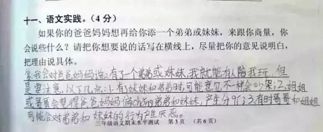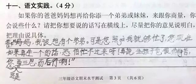 “爸妈生二胎,老大啥感受?”广州天河区三年级语文考试题与时俱进地考起了二胎政策。三年级小学生的答案让人笑趴了,求爸爸妈妈看到卷子之后的心理阴影面积!