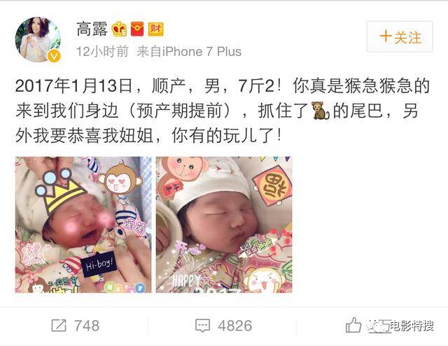 欣喜之余在微博微博宣布二胎生子的喜讯:“2017年1月13日,顺产,男,7斤2!你真是猴急猴急的来到我们身边(预产期提前),抓住了猴子的尾巴,另外我要恭喜我妞姐,你有的玩儿了!”
