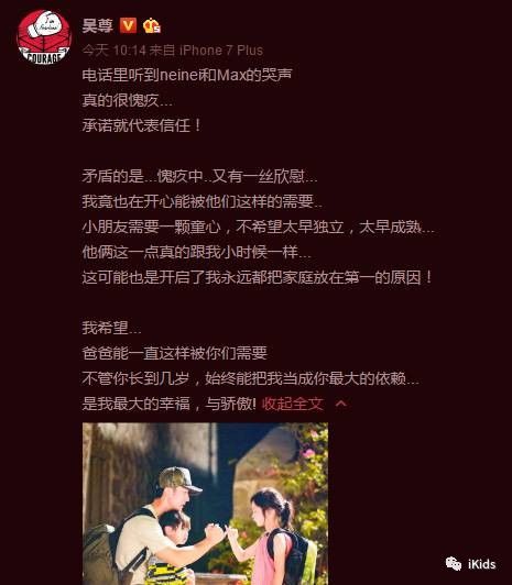 这个综艺节目播出之后有一个插曲,就是微博里有人声讨neinei公主病,“六岁多了爸爸一走就哭”。吴尊立刻发微博支持女儿,并再次强调自己的人生里,家庭第一,会信守每一个对孩子的承诺。