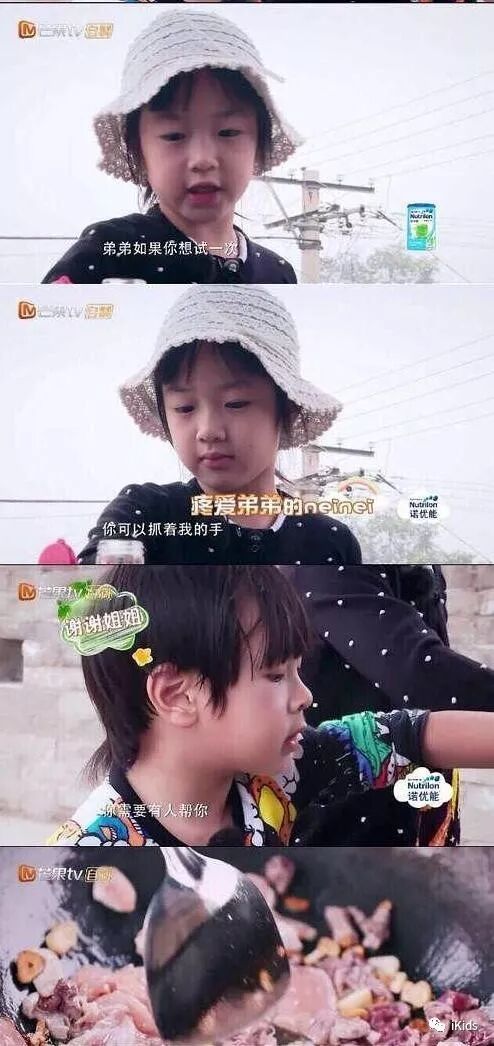 于是就有了有爱、有担当的女儿,在弟弟很想进厨房体验烧菜时,neinei又是一个小细节打动了我。她说“不可以”、“很危险”,但她握住弟弟的手,让弟弟比划几下烧菜。