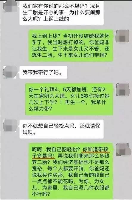 在接下来的对话中也大概了解了女人为什么那么不愿意生二胎,不是怕辛苦,也不是不愿意给老公生,原来当初生第一胎的时候因为是个女儿,婆家人很不高兴,老公也没有当父亲的喜悦,倒有些嫌弃之意,一家人不管不顾,女儿吃喝拉撒全靠她一个人,一边照顾孩子一边还要工作,每天忙里忙外,辛辛苦苦,累死累活,公婆和老公就像没看见似的,现在女儿都六岁了,说实在的家里条件也不是太好,实在无力再承当一个孩子的开销。