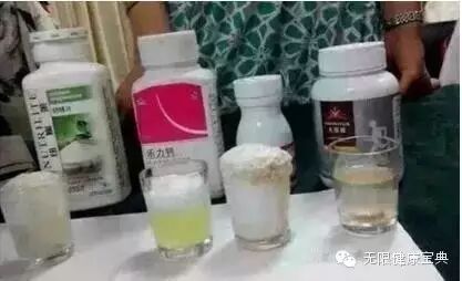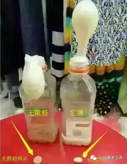无限极钙片(左)和他公司钙镁片(右)的产品演示对比图!液体是白醋,模拟胃酸。