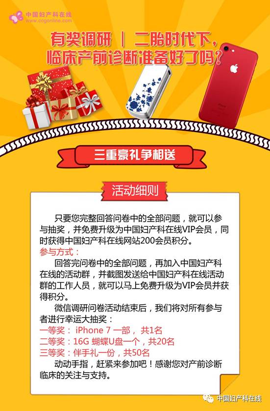 即日起,中国妇产科在线将针对从事产前诊断的临床医生,围绕产前诊断的实际问题推出问卷调研有礼活动,您只需2-3分钟在线完成调研问卷就有机会赢取奖品。