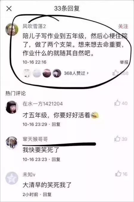 前段时间,晚上到处吐槽陪娃写作业的。还有家长陪写作业陪到心梗住院的: