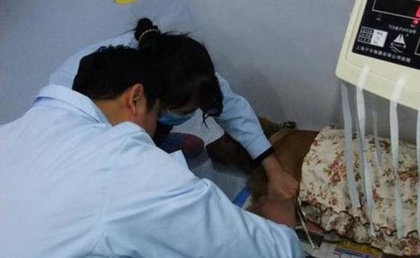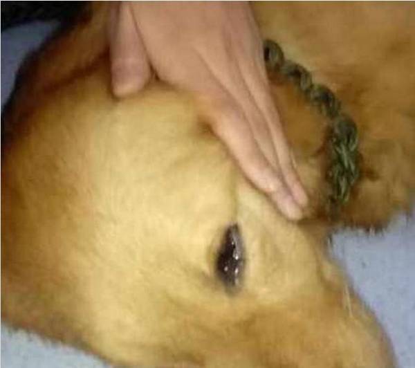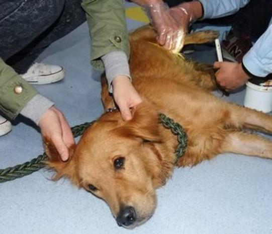 主人急忙抱着金毛来到最近的医院,医生也紧急的给狗狗进行了治疗,主人在一旁看着心好痛,金毛已经快没有力气了,躺在那里,余光望着主人,眼角都流下了眼泪。