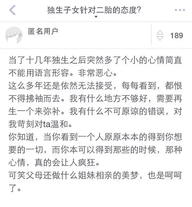 这是知乎一个问题的匿名回答,赞同的不在少数,真真实实地体现了一部分独生子女的心理问题——“弟弟/妹妹会分掉爸爸妈妈的爱”“我不够好吗?为什么他们还需要另一个?”“这一切原本都是我的,为什么突然全被另一个人抢走?”