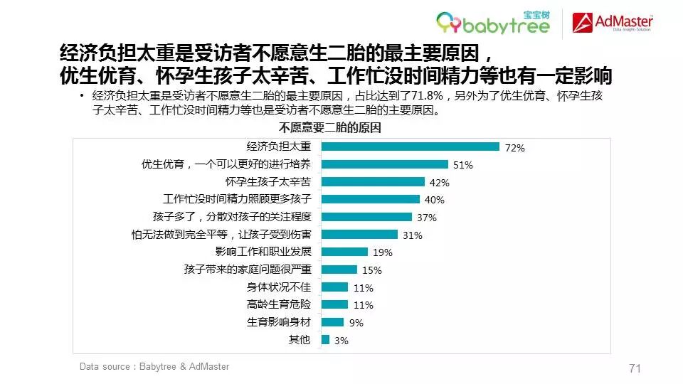 两娃虽好,但多出一倍的经济压力,让本已被生活重担压得喘不过气的父母如何承担呢?超过7成父母认为,经济负担太重是阻碍他们选择二胎的最重要因素;除此之外,优生优育、怀孕生子辛苦、工作忙没时间没精力也让他们心有余而力不足。