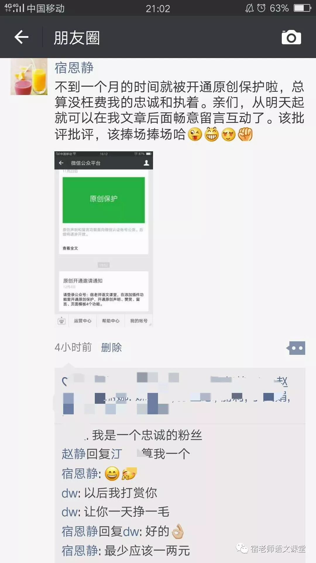 刚刚我在语文组郑重宣布二胎满月的喜讯,妹妹们也争相说要给我下奶。哈哈,腾讯公司真贴心啊!这不,怕我钱包装不下,赞赏功能也及时开通啦。回“天”然无公害已无力,所以宿老师只要奶粉钱。