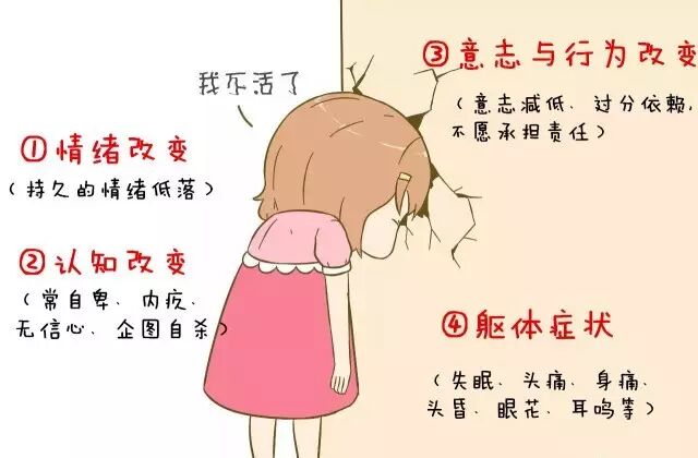 主要症状:情绪低落,快感缺乏,悲伤哭泣,担心多虑等。