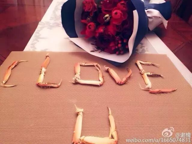 谢楠给吴京的纪念日礼物:蟹脚拼的 I Love U