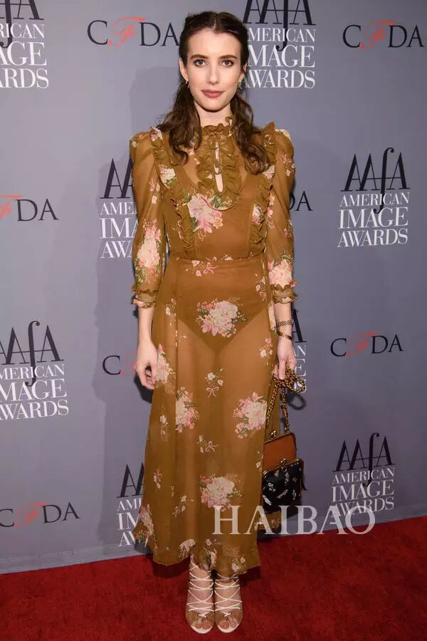 艾玛·罗伯茨 (Emma Roberts) 2017年4月24日亮相美国服装鞋类协会举办的颁奖礼;连衣裙:蔻驰 (COACH)
