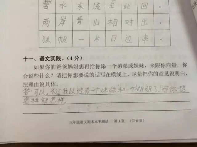 昨天上午,广州小学期末考试开考,其中天河区三年级语文考试的一道四分的语言实践题,成为全城讨论热点。孩子们五花八门的答案传遍朋友圈,童言无忌引得网友欢乐无比。