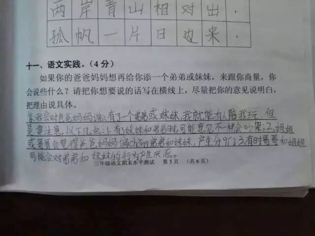 一个小朋友详细列举了要弟弟的理由:男的可以养家:男的更能吃苦;男的花钱少会挣钱等等。