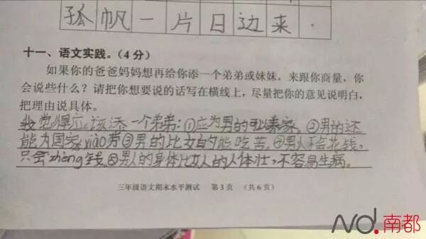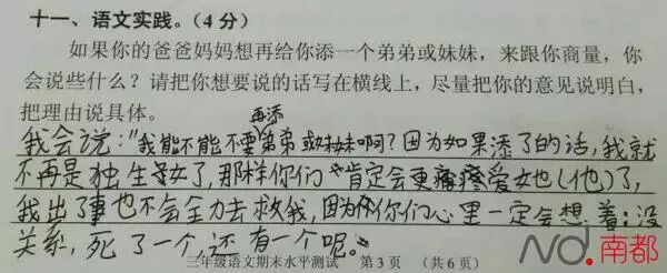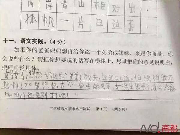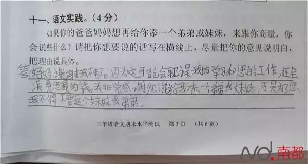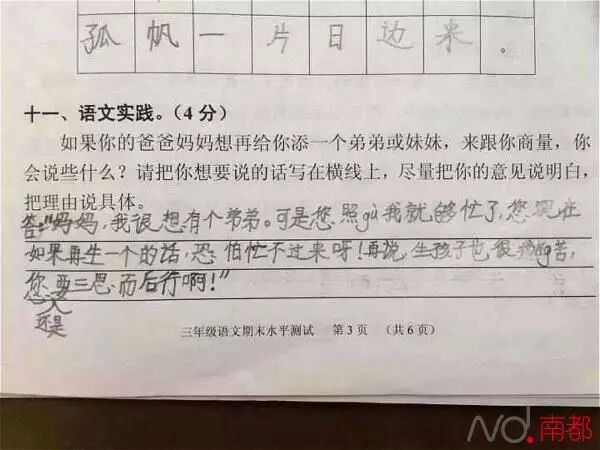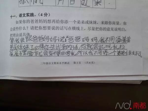 今日广州的小学生迎来了语文考试,家长群纷纷在转发孩子们的考试卷,一时间试卷满天飞。“爸妈生二胎,老大啥感受?”天河区三年级语文考试题与时俱进地考起了二胎政策。三年级小学生的答案让人笑趴了,爸爸妈妈表示伤不起!