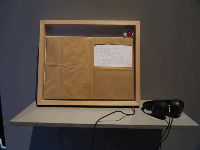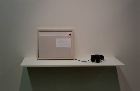 《单一声明》,框中笔记本, 新闻纸,哼一个动物园,言语录音 (3'23'' 循环),耳机,架台(2011)