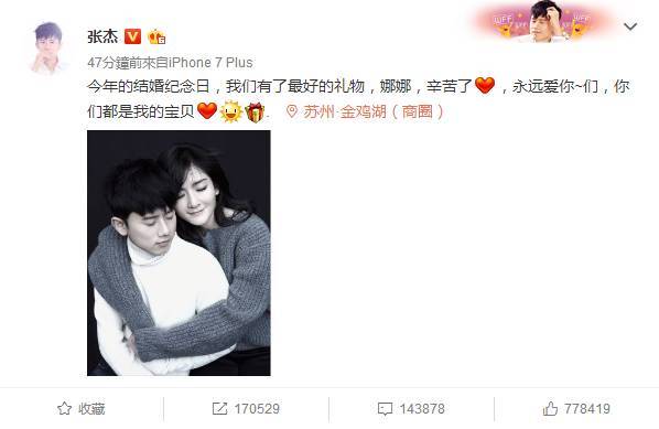 在他们结婚纪念日这天,张杰在微博宣布谢娜怀孕喜讯!