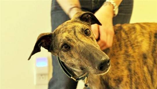 这只灰狗在4岁的时候被从赛狗场解救了出来,灰狗因为天生跑得快,经常被人们当成赛狗的工具。
