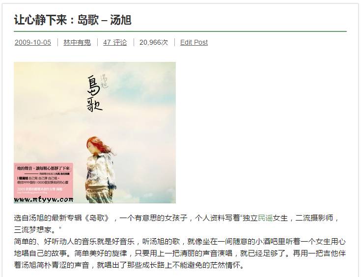 还是在2009年,发现了汤旭的《岛歌》。好音乐,即使过了那么多年,依旧不会忘怀。如果没记错的话,当时是女朋友推荐给我的,文案也是她写的。